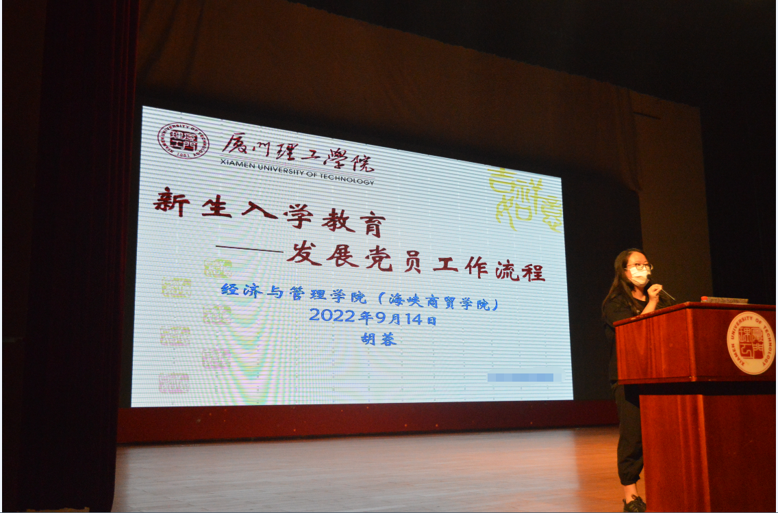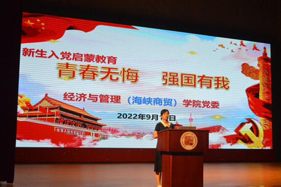 为了加深新生对党的基本知识的了解,端正入党动机,树立正确三观,引导大学新生爱党、爱国、为中华崛起而刻苦学习,2022年9月14日下午15:30,经济与管理学院(海峡商贸学院)党委组织2022级新生,在艺术会堂开展了“青春无悔 强国有我”入党启蒙教育。会议由学院党委庄沪娟副书记主持。