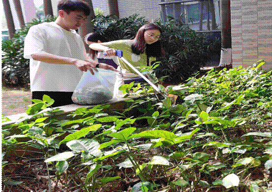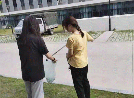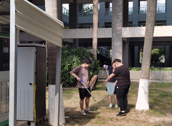 明确分工后,志愿者们热情高涨、干劲十足。大家手持清洁工具来到明理园7号楼周边,有的用钳子从绿化带中拾捡垃圾,有的用垃圾袋接过身边党员拾捡的垃圾,大家配合默契,很快就完成了垃圾清捡,整理后的教学楼周边焕然一新。