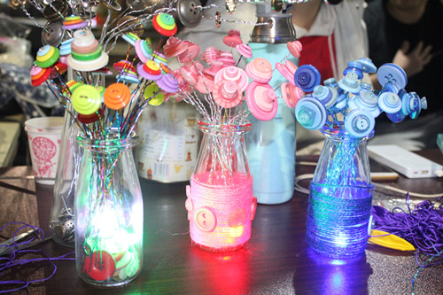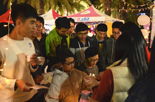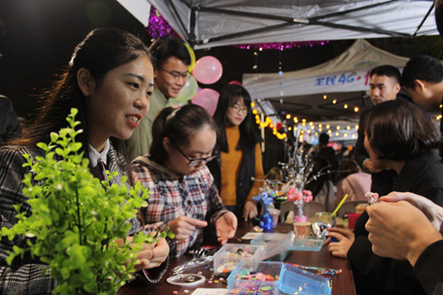 夜色将至,同学们接踵而至,各摊位前门庭若市。期间,“暖暖的很贴心”摊位以猜方言送热饮的方式,使得参与的同学们感到一份贴心的温暖。“手工纽扣花DIY”将寻常之物——纽扣拼凑成一幅幅精妙绝伦的作品,同学们动手操作,其丝丝精致,令人赞叹。而“烟笼雾锁”更是鼓励同学们发挥个人的丰富想象对灯笼进行个性大胆创作,在夜晚中增添一道亮丽的色彩,体现了中国灯笼文化的独特魅力。“环中花”以各色花腾制作成花环、手环、发箍等,在花环中缠绕仿真花朵藤条叶和led灯,以配合夜晚"迎新年"气氛。各摊位人员心思巧妙,玩物更是妙趣横生,意义非凡,为大家留下了美好的回忆。