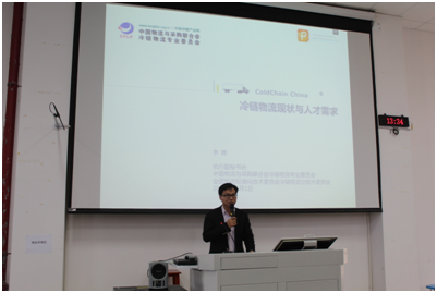 第一位演讲嘉宾是中国物流与采购联合会冷链委员会执行副秘书长李胜先生,李胜先生的主题为《冷链物流发展现状与人才需求》。发言分为四个部分:我国冷链物流的现状、冷链物流人才需求特点、在校期间的准备和未来的就业机会。发言中他为大家详细的介绍了何为冷链物流,列举了生活中的事例,帮助大家更好的理解冷链物流。