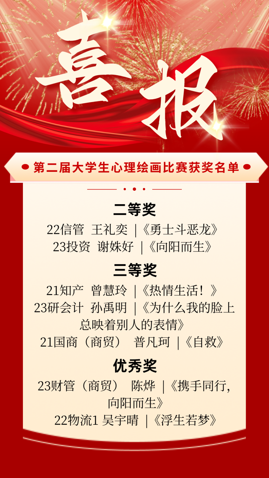 心理健康是健康的重要组成部分。我画我心,可以让我们更好地了解自己、发展自己;我画我心,是一种压力的释放、情绪的调节、自我的成长。我校于4-5月开展了第二届大学生心理绘画比赛,本次大赛以“以画绘心,艺润人心”为主题,吸引了众多学生参与,经过专业评委老师对参赛作品进行心理内容、绘画技巧等两轮打分,我院共有7名学生获奖。具体名单如下: