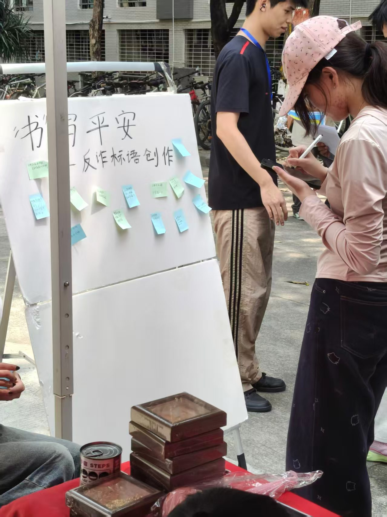 活动现场精心打造五大趣味互动体验区,吸引全院学子踊跃参与、沉浸式打卡。大家拿起便签在KT板上写下反诈宣言,用创意文字传递反诈态度;在诈骗话术连连看、情景卡推演区层层拆解骗局套路,让识诈防诈的“雷达”更敏锐;反诈快问快答、幸运转盘区更是热闹非凡,同学们在限时抢答、趣味闯关里收获反诈知识,凭集章卡就能兑换心仪礼品。
