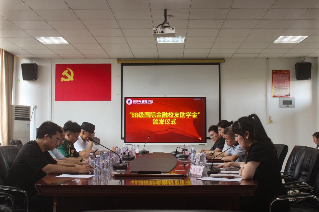 初夏时节,暖意融融。2025年6月11日,经济与管理学院(海峡商贸学院)“88级国际金融校友助学金”颁发仪式暨校友分享交流会在明理楼7-308会议室举行。88级国际金融班校友代表、学院院长陈占葵、学院党委副书记姜红波、学工处学生素质发展中心副主任彭倩、学院团委副书记邱芳艳和辅导员邢小浩老师参加。会议由学院团委副书记邱芳艳主持。